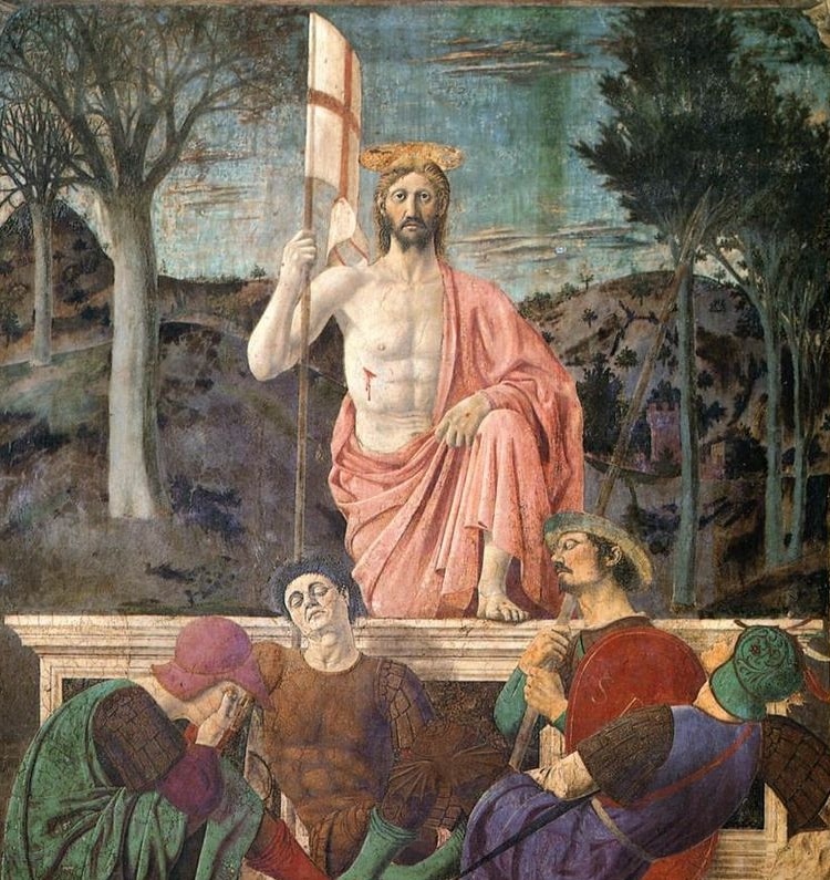 L’interprétation de la Résurrection de Sansepolcro s’ouvre ainsi sur un détail, dont la présence a été peu notée et jamais vraiment élucidée quand elle l’a été, celle d’une vraie pierre d’achoppement donc, mal dégrossie et déposée dans l’angle inférieur gauche de la fresque, entre des pierres taillées quant à elles : derrière la base de la colonne corinthienne et devant le tombeau sur lequel le Christ ressuscité pose son pied stigmatisé. Dans l’économie de l’œuvre et au sein du système théologique dans lequel s’inscrit sa représentation, cette pierre devient un objet de projection pour le dévot qui peut par conséquent la lire tour à tour comme l’une des pierres-reliques rapportées du Saint-Sépulcre dans cette bourgade toscane qui tira de ce transfert et sa gloire et son nom – Sansepolcro – et comme un emblème de la mort du Christ, voire comme une préfiguration du sarcophage-autel emblématisant sa résurrection.