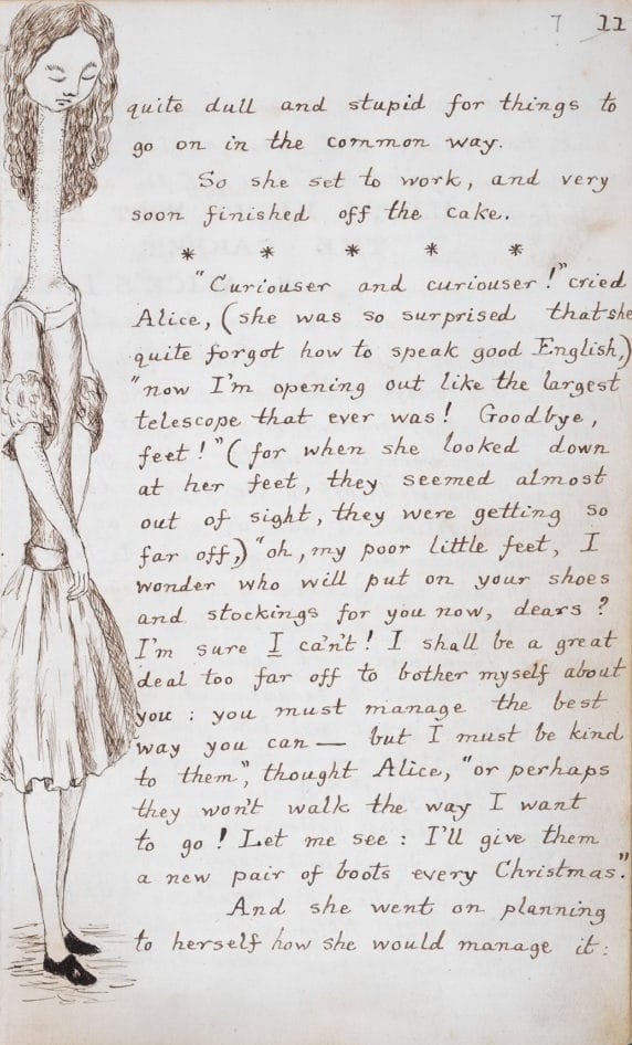Ici s’opère un changement de point de vue. Et nous sommes, durant les cinq paragraphes qui suivent, dans la tête de la sœur. Celle-ci, avec une singulière puissance d’empathie, se met à imaginer Alice adulte. Surtout, elle se met à éprouver la nostalgie qui ne manquera pas de poindre chez Alice lorsque, devenue une femme mûre, elle racontera aux enfants « l’ancien rêve du Pays des merveilles » (the dream of Wonderland of long ago).