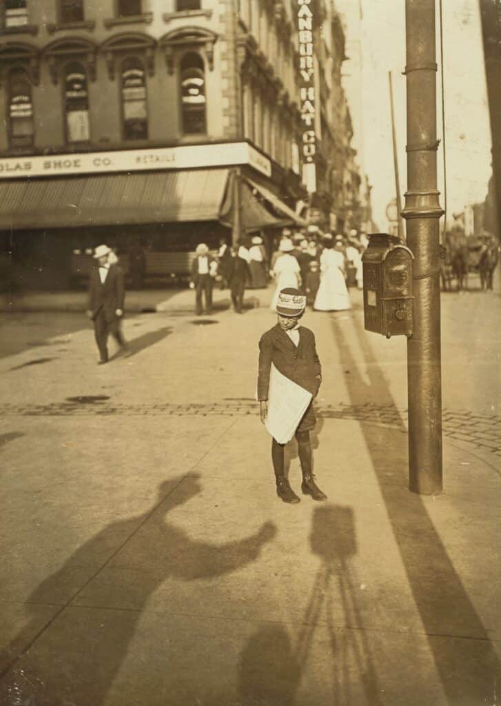 Cet imaginaire du journal est renforcé par quelques photographies de jeunes garçons vendeurs de journaux, en bande, aux allures volontaires, courant les rues, de porte à porte, pour distribuer les abonnements des clients. Ces photographies de Lewis Hine, sociologue documentariste des années 1930, rejoindront les clichés pris à Ellis Island à l’arrivée des immigrants, de même que ces enfants suant dans les sardineries ou les mines aux États-Unis. L’enfance en danger est déjà représentée.